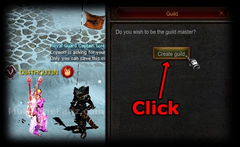 Once you reach character level 100, you can create a guild by speaking with Royal Guard Captain Lorence.