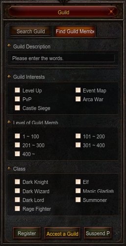 You can quickly find a guild to join using guild matching! You can set up matching to find a guild, or to help recruit guild members in your existing guild. Players can only join a guild through matching if the guild is registered in the guild matching feature. If someone requests to join your guild, a notification icon will appear to the Guild Master. Guild Masters can accept or deny the request by clicking the notification icon.